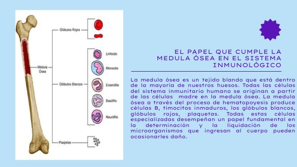 La medula ósea es un tejido blando que está dentro de la mayoría de nuestros huesos. Todas las células del sistema inmunitario humano se originan a partir de las células madre en la medula ósea. La medula ósea a través del proceso de hematopoyesis produce células B, timocitos inmaduros, los glóbulos blancos, glóbulos rojos, plaquetas. Todas estas células especializadas desempeñan un papel fundamental en la determinación y la liquidación de los microorganismos que ingresan al cuerpo pueden ocasionarles daño.