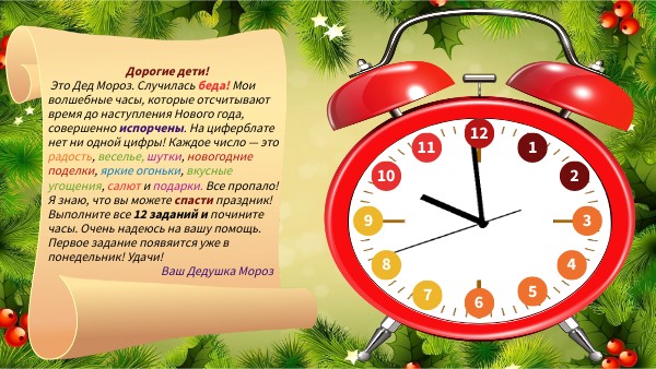 Дорогие дети! Это Дед Мороз. Случилась беда! Мои волшебные часы, которые отсчитывают время до наступления Нового года, совершенно испорчены. На циферблате нет ни одной цифры! Каждое число — это радость, веселье, шутки, новогодние поделки, яркие огоньки, вкусные угощения, салют и подарки. Все пропало! Я знаю, что вы можете спасти праздник! Выполните все 12 заданий и почините часы. Очень надеюсь на вашу помощь. Первое задание появяится уже в понедельник! Удачи! Ваш Дедушка Мороз