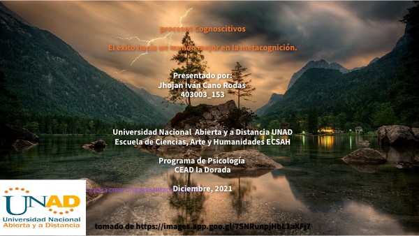 procesos Cognoscitivos El éxito hacía un mundo mejor en la metacognición. Presentado por: Jhojan Iván Cano Rodas 403003_153 Universidad Nacional Abierta y a Distancia UNAD Escuela de Ciencias, Arte y Humanidades ECSAH Programa de Psicología CEAD la Dorada Diciembre, 2021 tomado de https://images.app.goo.gl/7SNRunpjHbL1aXFj7
