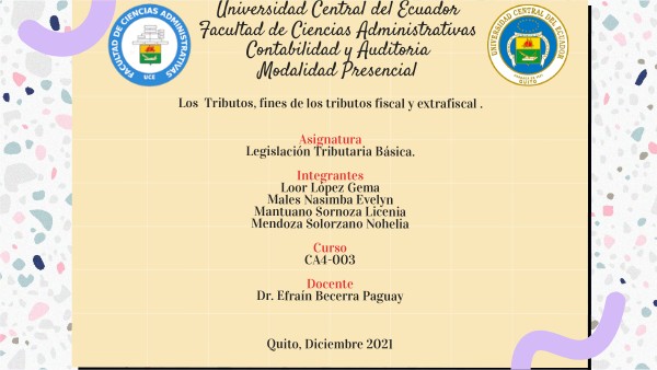 Los Tributos, fines de los tributos fiscal y extrafiscal . Asignatura Legislación Tributaria Básica. Integrantes Loor López Gema Males Nasimba Evelyn Mantuano Sornoza Licenia Mendoza Solorzano Nohelia Curso CA4-003 Docente Dr. Efraín Becerra Paguay Quito, Diciembre 2021