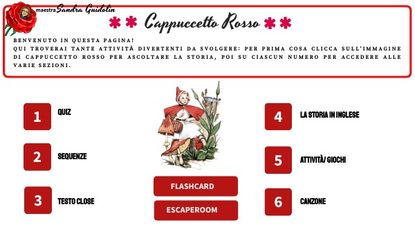 Benvenuto in questa paginA! qui troverai tante attività divertenti da svolgere: per prima cosa clicca sull'immagine di Cappuccetto Rosso per ascoltare la storia, poi su ciascun numero per ACCEDERE ALle VARIE SEZIONI.