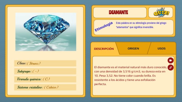 El diamante es el material natural más duro conocido, con una densidad de 3,516 g/cm3, su dureza esta en 10. Pesa 3,52. No tiene color cuando brilla. Es resistente a los ácidos y tiene una exfoliación perfecta.