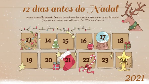 Preme na casilla marrón do día e descubre unha curtametraxe ou un conto do Nadal. (Importante premer na casilla marrón, NON no número)
