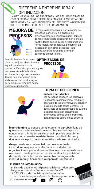 FUENTE DE INFORMACIÓN análisis de decisiones https://analisis-certidumbre-riesgoincertidumbre.fandom.com/es/wiki/A n%C3%A1lisis_de_decisiones inforges ceidor https://www.inforges.es/post/5- claves-optimizacion-procesosrecursos-e