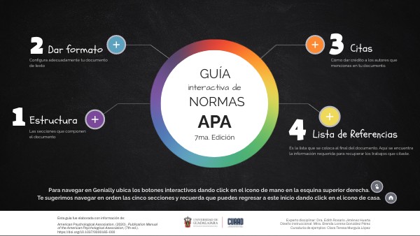 Para navegar en Genially ubica los botones interactivos dando click en el icono de mano en la esquina superior derecha.Te sugerimos navegar en orden las cinco secciones y recuerda que puedes regresar a este inicio dando click en el icono de casa.