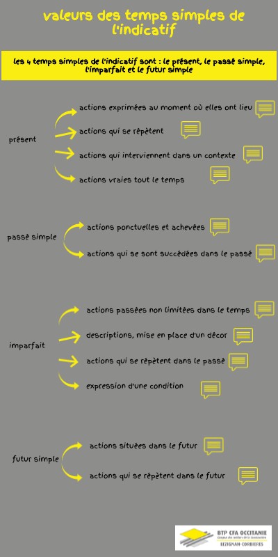 les 4 temps simples de l'indicatif sont : le présent, le passé simple, l'imparfait et le futur simple