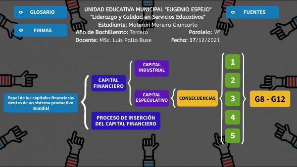 5. ¿Cuál es el objetivo del Capital Especulativo? Generar la mayor tasa de interés en el menor tiempo posible, y desaparecer justo después de haber cumplido con su objetivo. 6. ¿Cuáles son los factores a favor que tiene el capital especulativo en el contexto actual? Son varios y son justamente aquellos que lo impulsan. Entre esos están: la globalización, la fluctuación de las tasas de interés, el proceso de la oferta y la demanda, y el juicio de los agentes, los cuáles se hacen sobre los procesos económicos con fines de inversión posterior. 7. Escriba el dominio de los capitales especulativos en el sistema productivo en el contexto económico-financiero actual Los capitales especulativos dominan en economías desarrolladas, ya que estas pueden enfrentar mejor las crisis en caso de que algo salga mal. Por otra parte, eso no les conviene a las economías en desarrollo, pues sus probabilidades de recuperación no pueden basarse en la especulación. 8. Escriba 5 efectos de los capitales especulativos en las economías del mundo. Endeudamiento y Reajustes: Las economías y países subdesarrollados se ven en la situación forzada de endeudarse y hacer reajustes para poder subsistir y salir adelante. Pérdida del valor del trabajo: El sistema capitalista prima el capital sobre el trabajo y el ser human, y dado que los capitales son especulativos y producen muchísimo capital, ya no importa mucho el trabajo. Se desvirtúa el verdadero trabajo: Se defienden y se priman los créditos y la prestación de servicios, dejando el verdadero trabajo u otros trabajos de lado. Se prioriza al inversor: Dado que sin el inversor no habría capital generado por los intereses, se lo pone en primer lugar sobre todo. Desocupación: Las circunstancias anteriores hacen que los empleos duraderos y estables carezcan, provocando que la gente no tenga qué hacer y por tanto no generen dinero.