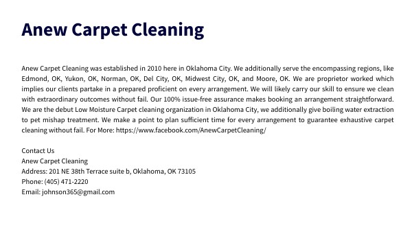 Anew Carpet Cleaning was established in 2010 here in Oklahoma City. We additionally serve the encompassing regions, like Edmond, OK, Yukon, OK, Norman, OK, Del City, OK, Midwest City, OK, and Moore, OK. We are proprietor worked which implies our clients partake in a prepared proficient on every arrangement. We will likely carry our skill to ensure we clean with extraordinary outcomes without fail. Our 100% issue-free assurance makes booking an arrangement straightforward. We are the debut Low Moisture Carpet cleaning organization in Oklahoma City, we additionally give boiling water extraction to pet mishap treatment. We make a point to plan sufficient time for every arrangement to guarantee exhaustive carpet cleaning without fail. For More: https://www.facebook.com/AnewCarpetCleaning/ Contact Us Anew Carpet Cleaning Address: 201 NE 38th Terrace suite b, Oklahoma, OK 73105 Phone: (405) 471-2220 Email: johnson365@gmail.com