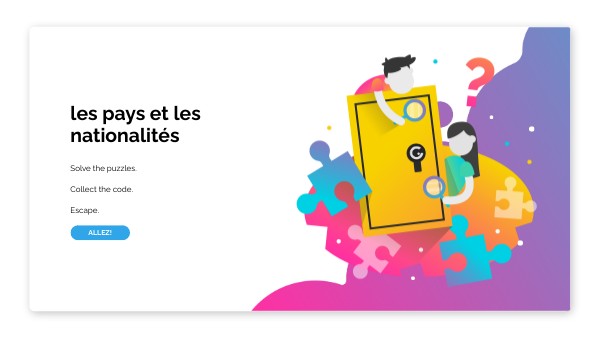 Created for S1 French. CONTENT = 1. QUIZ on en/au/aux/à. 2. CHERCHEZ with nationalities (masculine and feminine). 3. BONNE IMAGE with pictures of landmarks. 4. CONNECTIONS with flags and maps.
