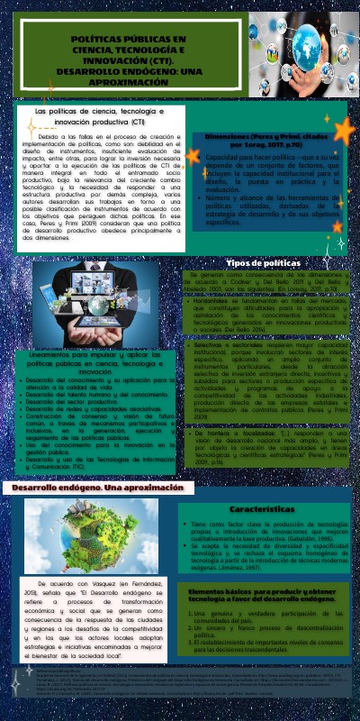 Referencias bibliográficas:Academia Nacional de la Ingeniería y el Hábitat (2013). Lineamientos de política en ciencia, tecnología e innovación. Consultado en: http://www.acading.org.ve › pubdocs › DOCS_CTI Fernández, J. (2013). Teorías del desarrollo endógeno. Presencia del Lenguaje del Desarrollo Endógeno en Venezuela. Consultado en: https://jfernandar.files.wordpress.com › 2013/03 › c... Loray, R. (2017). Políticas públicas en ciencia, tecnología e innovación: tendencias regionales y espacios de convergencia. Revista de Estudios Sociales 62: 68-80. Consultado en: https://dx.doi.org/10.7440/res62.2017.07 Sassone, P. y Camacho, M. (2005). Desarrollo endógeno: Un debate necesario. Consultado en: http://library.fes.de › pdf-files › bueros › caracas