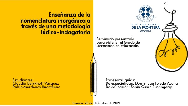 Por medio de la metodología lúdico-indagatoria se promueve el aprendizaje significativo de la unidad de “Nomenclatura inorgánica” en los y las estudiantes de primero medio, gracias a la combinación de estrategias indagatorias y estrategias lúdicas.