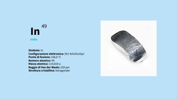 Simbolo: In Configurazione elettronica: [Kr] 4d105s25p1 Punto di fusione: 156,6 °C Numero atomico: 49 Massa atomica: 114,818 u Raggio di Van der Waals: 220 pm Struttura cristallina: tetragonale