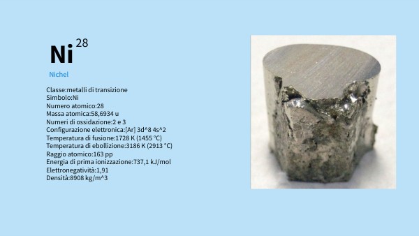 Classe:metalli di transizione Simbolo:Ni Numero atomico:28 Massa atomica:58,6934 u Numeri di ossidazione:2 e 3 Configurazione elettronica:[Ar] 3d^8 4s^2 Temperatura di fusione:1728 K (1455 °C) Temperatura di ebollizione:3186 K (2913 °C) Raggio atomico:163 pp Energia di prima ionizzazione:737,1 kJ/mol Elettronegatività:1,91 Densità:8908 kg/m^3