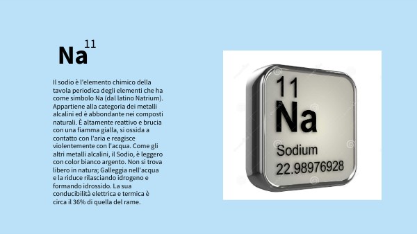 Il sodio è l'elemento chimico della tavola periodica degli elementi che ha come simbolo Na (dal latino Natrium). Appartiene alla categoria dei metalli alcalini ed è abbondante nei composti naturali. È altamente reattivo e brucia con una fiamma gialla, si ossida a contatto con l'aria e reagisce violentemente con l'acqua. Come gli altri metalli alcalini, il Sodio, è leggero con color bianco argento. Non si trova libero in natura; Galleggia nell'acqua e la riduce rilasciando idrogeno e formando idrossido. La sua conducibilità elettrica e termica è circa il 36% di quella del rame.