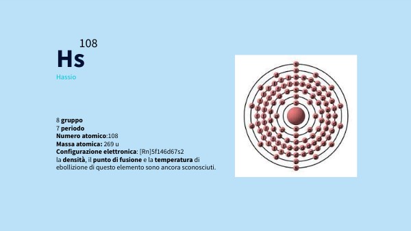 8 gruppo 7 periodo Numero atomico:108 Massa atomica: 269 u Configurazione elettronica: [Rn]5f146d67s2 la densità, il punto di fusione e la temperatura di ebollizione di questo elemento sono ancora sconosciuti.