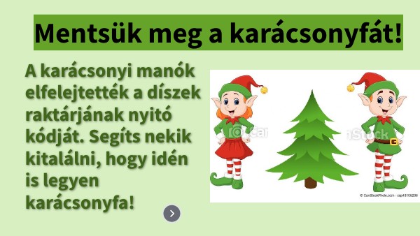 A karácsonyi manók elfelejtették a díszek raktárjának nyitó kódját. Segíts nekik kitalálni, hogy idén is legyen karácsonyfa!