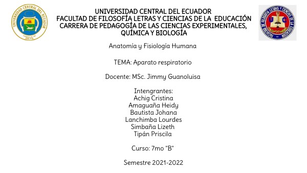 TEMA: Aparato respiratorio Docente: MSc. Jimmy Guanoluisa Intengrantes: Achig Cristina Amaguaña Heidy Bautista Johana Lanchimba Lourdes Simbaña Lizeth Tipán Priscila Curso: 7mo "B" Semestre 2021-2022
