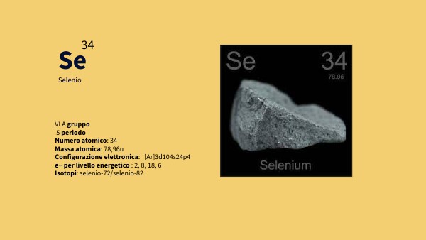 VI A gruppo 5 periodo Numero atomico: 34 Massa atomica: 78,96u Configurazione elettronica: [Ar]3d104s24p4 e− per livello energetico : 2, 8, 18, 6 Isotopi: selenio-72/selenio-82