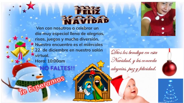 Ven con nosotros a celebrar un día muy especial llena de alegrías, risas, juegos y mucha diversión. Nuestro encuentro es el mièrcoles 22 de diciembre en nuestro salón virtual. Hora: 10:00am