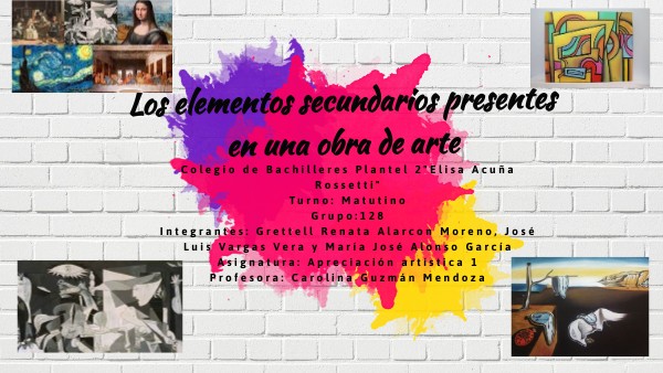 Esta actividad me sirvió principalmente para conocer que no solamente las obras artísticas cuentan co elementos básicos, sino igualmente con elementos secundarios, es interesante conocerlos, porque te das cuenta que están en donde menos te lo imaginabas, en conclusión, me gustó bastante la actividad.Por :Alonso García María José