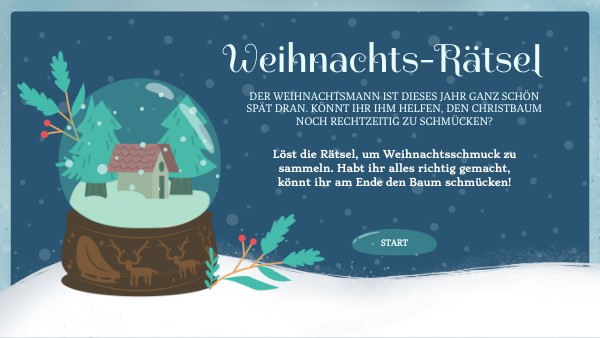 Löst die Rätsel, um Weihnachtsschmuck zu sammeln. Habt ihr alles richtig gemacht, könnt ihr am Ende den Baum schmücken!