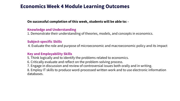 On successful completion of this week, students will be able to: -Knowledge and Understanding1. Demonstrate their understanding of theories, models, and concepts in economics. Subject-specific Skills 4. Evaluate the role and purpose of microeconomic and macroeconomic policy and its impactKey and Employability Skills5. Think logically and to identify the problems related to economics.6. Critically evaluate and reflect on the problem-solving process.7. Engage in discussion and review of controversial issues both orally and in writing.8. Employ IT skills to produce word-processed written work and to use electronic information databases.