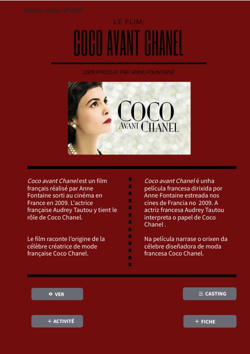 Coco avant Chanel é unha película francesa dirixida por Anne Fontaine estreada nos cines de Francia no 2009. A actriz francesa Audrey Tautou interpreta o papel de Coco Chanel .Na película narrase o orixen da célebre diseñadora de moda francesa Coco Chanel.