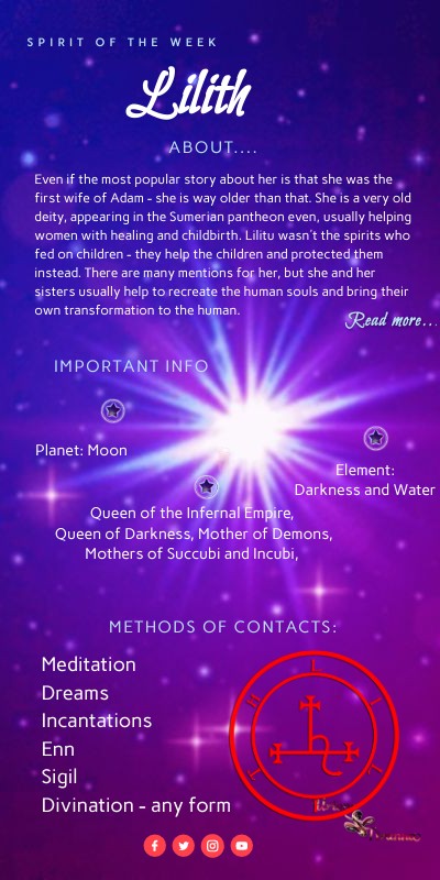 Even if the most popular story about her is that she was the first wife of Adam - she is way older than that. She is a very old deity, appearing in the Sumerian pantheon even, usually helping women with healing and childbirth. Lilitu wasn't the spirits who fed on children - they help the children and protected them instead. There are many mentions for her, but she and her sisters usually help to recreate the human souls and bring their own transformation to the human.