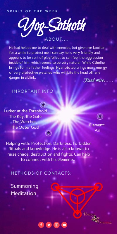 He had helped me to deal with enemies, but given me familiar for a while to protect me. I can say he is very friendly and appears to be sort of playful but to can feel the aggression inside of him, which seems to be very natural. While Cthulhu brings for me father feelings, Nyarlototep brings more energy of very protective watched who will bite the head off any danger in a blink.