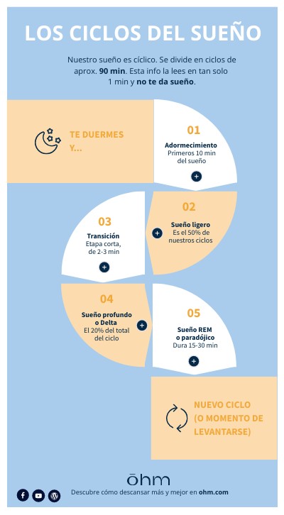 Nuestro sueño es cíclico. Se divide en ciclos de aprox. 90 min. Esta info la lees en tan solo 1 min y no te da sueño.