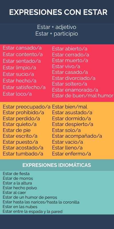 Estar de fiesta Estar de morros Estar a la altura Estar hecho polvo Estar al caer Estar de un humor de perros Estar hasta las narices/hasta la coronilla Estar en las nubes Estar entre la espada y la pared