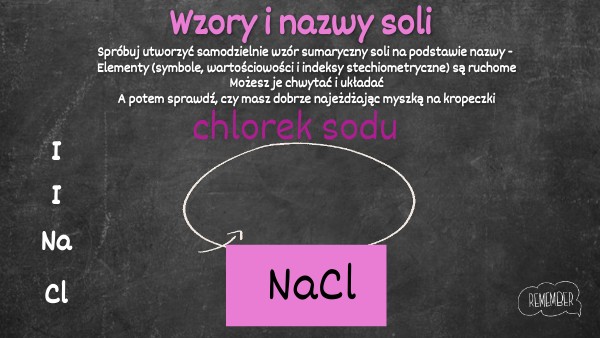 Spróbuj utworzyć samodzielnie wzór sumaryczny soli na podstawie nazwy - Elementy (symbole, wartościowości i indeksy stechiometryczne) są ruchome Możesz je chwytać i układać A potem sprawdź, czy masz dobrze najeżdżając myszką na kropeczki