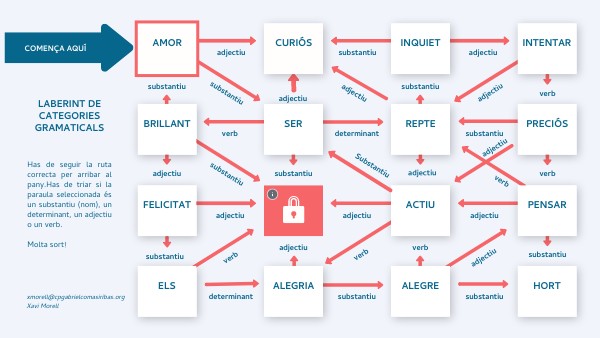 Has de seguir la ruta correcta per arribar al pany.Has de triar si la paraula seleccionada és un substantiu (nom), un determinant, un adjectiu o un verb. Molta sort!