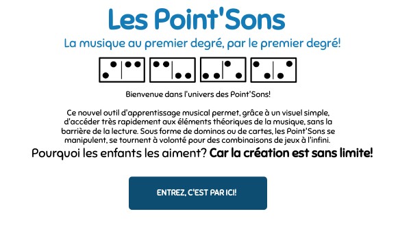 Bienvenue dans l'univers des Point'Sons! Ce nouvel outil d'apprentissage musical permet, grâce à un visuel simple, d'accéder très rapidement aux éléments théoriques de la musique, sans la barrière de la lecture. Sous forme de dominos ou de cartes, les Point'Sons se manipulent, se tournent à volonté pour des combinaisons de jeux à l'infini.