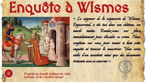 « Le seigneur de la seigneurie de Wismes, Enguerrand, a été tué dans son château, un mardi matin. Rendez-vous sur place immédiatement pour élucider ce crime. Nous comptons sur vous pour mener à bien cette enquête et trouver le meurtrier. Vous serez aidés d’un assistant ainsi que des documents transmis avec ce courrier ».