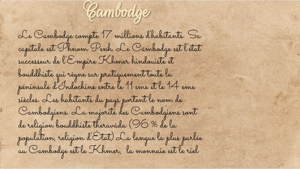 Le Cambodge compte 17 millions d'habitants. Sa capitale est Phnom Penh. Le Cambodge est l’état successeur de l’Empire Khmer hindouiste et bouddhiste qui règne sur pratiquement toute la péninsule d’Indochine entre le 11 eme et le 14 eme siècles. Les habitants du pays portent le nom de Cambodgiens. La majorité des Cambodgiens sont de religion bouddhiste theravāda (96 % de la population, religion d'État ).La langue la plus parlée au Cambodge est le Khmer, la monnaie est le riel