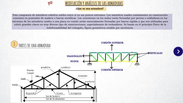 ¿Que es una armadura? Esta compuesta de miembros esbeltos unidos entre si en sus puntos extremos. Los miembros usados comúnmente en construcción consisten en puntuales de madera o barras metálicas. Las conexiones en los nudos están formadas por pernos o soldaduras en los extremos de los miembros unidos a una placa en común están esencialmente formadas por barras rígidas y que son utilizadas para cubrir grandes claros en muy diverso tipo de construcciones, especialmente de techumbres. Se basan en el principio físico de la indeformabilidad del triángulo, figura geométrica estable por excelencia.