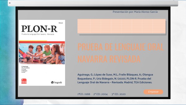 Aguinaga, G.; López de Suso, M.L.; Fraile Blázquez, A.; Olangua Baquedano, P.; Uriz Bidegain, N. (2020), PLON-R. Prueba del Lenguaje Oral de Navarra – Revisada. Madrid, TEA Ediciones. 1ªED.: 1988 2ª ED.: 2004 3ª ED.: 2020