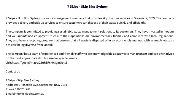 7 Skips - Skip Bins Sydney is a waste management company that provides skip bin hire services in Greenacre, NSW. The company provides delivery and pick-up services to ensure customers can dispose of their waste quickly and efficiently. The company is committed to providing sustainable waste management solutions to its customers. They have invested in modern and well-maintained equipment to ensure their operations are environmentally friendly and compliant with local regulations. They also have a recycling program that ensures that all waste is disposed of in an eco-friendly manner, with as much waste as possible being diverted from landfill. The company has a team of experienced and friendly staff who are knowledgeable about waste management and can offer advice on the most appropriate skip bin size for specific needs. visit:https://goo.gl/maps/2ZuRTR6kH8gmQojs5 Contact Us : 7 Skips - Skip Bins Sydney Address:56 Rosedale Ave, Greenacre, NSW 2190 Phone:1300701701 Email:info@7skipbins.com.au