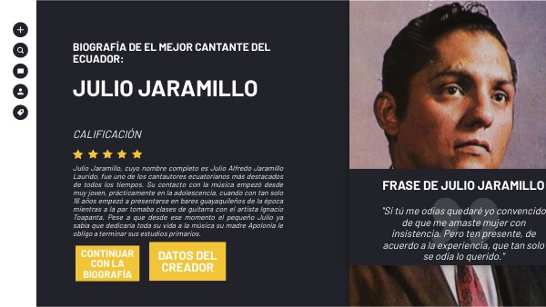 Julio Jaramillo, cuyo nombre completo es Julio Alfredo Jaramillo Laurido, fue uno de los cantautores ecuatorianos más destacados de todos los tiempos. Su contacto con la música empezó desde muy joven, prácticamente en la adolescencia, cuando con tan solo 16 años empezó a presentarse en bares guayaquileños de la época mientras a la par tomaba clases de guitarra con el artista Ignacio Toapanta. Pese a que desde ese momento el pequeño Julio ya sabía que dedicaría toda su vida a la música su madre Apolonia le obligo a terminar sus estudios primarios.