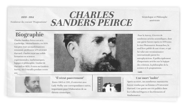 « Charles Sanders Peirce ». Wikipédia, 17 janvier 2022. Wikipedia, https://fr.wikipedia.org/w/index.php?title=Charles_Sanders_Peirce&oldid=189962533. Charles Sanders Peirce : Biographie et bibliographie / Signo - Théories sémiotiques appliquées. http://www.signosemio.com/peirce/index.asp. Consulté le 26 janvier 2022. Charles Sanders Peirce : La sémiotique / Signo - Théories sémiotiques appliquées. http://www.signosemio.com/peirce/semiotique.asp. Consulté le 29 janvier 2022. « Images libres de droit, stock photos, vectoriels, vidéos libres de droit - iStock ». iStockPhoto.com, https://www.istockphoto.com/fr/. Consulté le 29 janvier 2022. « Le signe selon Charles S. Peirce ». Quentin Gille, 19 septembre 2019, https://quentingille.wordpress.com/2019/09/19/le-signe-selon-charles-s-peirce/. SIGNIFIANT : Définition de SIGNIFIANT. https://www.cnrtl.fr/definition/signifiant. Consulté le 26 janvier 2022. SIGNIFIER : Définition de SIGNIFIER. https://www.cnrtl.fr/definition/signifier. Consulté le 26 janvier 2022.