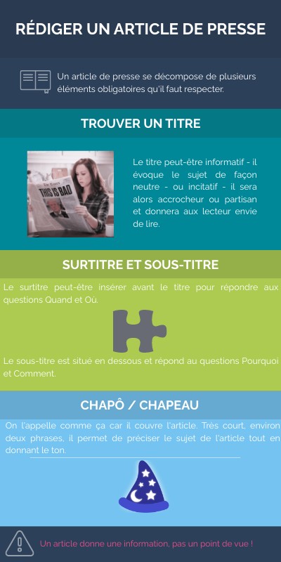 Un article de presse se décompose de plusieurs éléments obligatoires qu'il faut respecter.