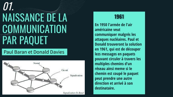 En 1950 l'armée de l'air américaine veut communiquer malgrés les attaques nucléaires. Paul et Donald trouveront la solution en 1961, qui est de découper lezs messages en paquets pouvant circuler à travers les multiples chemins d'un réseau ainsi meme si le chemin est coupé le paquet peut prendre une autre direction et arrivé à son destinataire.