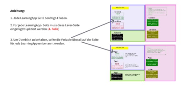 Anleitung: 1. Jede LearningApp Seite benötigt 4 Folien. 2. Für jede LearningApp- Seite muss diese Lavar-Seite eingefügt/dupliziert werden (4. Folie) 3. Um Überblick zu behalten, sollte die Variable überall auf der Seite für jede LearningApp umbenannt werden.