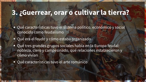 Pág. 50: 7. ¿Cómo responderías a la pregunta que encabeza el apartado del punto 2? Razona tu respuesta 8. Fíjate en la pirámide de la sociedad medieval y explica cómo estaba organizada la sociedad. ¿Qué función correspondía a cada estamento? ¿Qué desigualdades existían entre ellos? 10. Compara la sociedad feudal y la actual: - ¿Qué diferencias hay entre los estamentos feudales y las clases sociales actuales? -¿Crees que nuestra sociedad es mejor, igual o peor que la medieval? ¿Por qué? - Señala tres aspectos que más te desagraden de la sociedad feudal.