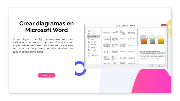En un diagrama de flujo se muestran los pasos secuenciales de una tarea o proceso. Puede usar una amplia variedad de diseños de SmartArt para mostrar los pasos de un proceso, incluidos diseños que pueden contener imágenes