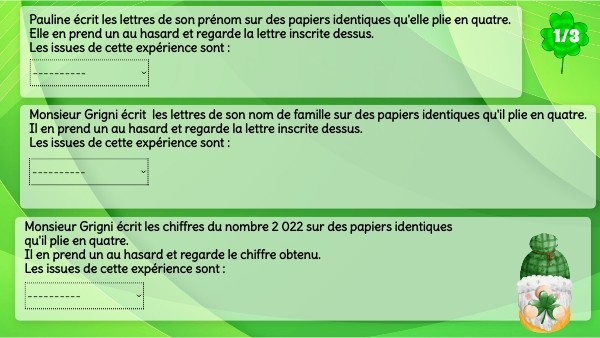 Monsieur Grigni écrit les lettres de son nom de famille sur des papiers identiques qu'il plie en quatre. Il en prend un au hasard et regarde la lettre inscrite dessus. Les issues de cette expérience sont :