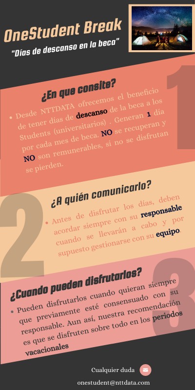 - Desde NTTDATA ofrecemos el beneficio de tener días de descanso de la beca a los Students (universitarios) . Generan
