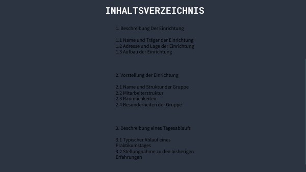 1. Beschreibung Der Einrichtung 1.1 Name und Träger der Einrichtung 1.2 Adresse und Lage der Einrichtung 1.3 Aufbau der Einrichtung 2. Vorstellung der Einrichtung 2.1 Name und Struktur der Gruppe 2.2 Mitarbeiterstruktur 2.3 Räumlichkeiten 2.4 Besonderheiten der Gruppe 3. Beschreibung eines Tagesablaufs 3.1 Typischer Ablauf eines Praktikumstages 3.2 Stellungnahme zu den bisherigen Erfahrungen