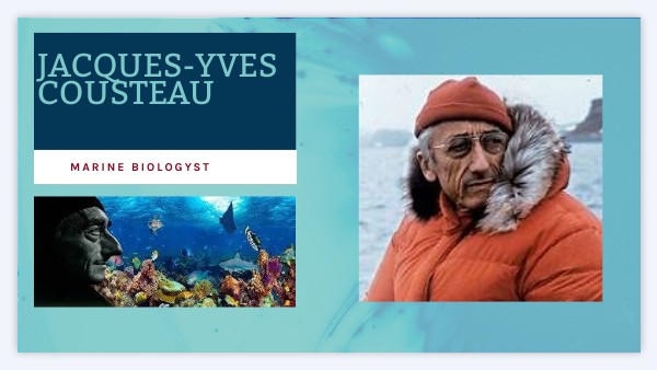 Jacques-Yves Cousteau (Saint-André-de-Cubzac, 11 June 1910 – Paris, 25 June 1997) was a French naval officer, explorer, researcher and marine biologist who studied the sea and its inhabitants. He also made a TV series called : The Undersea World Of Jaques Cousteau , and a film called : The Odyssey.